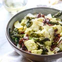 • To serve the pasta, add it to the skillet with the asparagus. Toss the hot gnocchi with the pesto and a touch of pasta water – I only add about 1/4 cup first until I get the consistency I like. Add to a bowl with the asparagus pieces and spritz with lemon – then sprinkle the bacon overtop. Top with extra shaved parm.