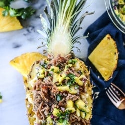 • To serve, top the rice with the shredded pork and pineapple salsa. To serve in a pineapple bowl, carefully slice the pineapple in half lengthwise. Remove the fruit (I did so using a paring knife and grapefruit spoon, then used it for the salsa) and place the rice and pork inside. Easy peasy.