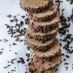 - Use your hands to scoop out the dough and roll it into a log that’s about 8 to 10 inches long. I wrapped mine in plastic wrap and rolled it until very smooth. If it gets too sticky, stick it in the fridge or freezer for 15 minutes. Place the chocolate sprinkles on a piece of parchment paper and roll the dough through the sprinkles to evenly coat. Wrap up the log and place it back in the fridge or freezer (just depending on how cold you want it!) for about 30 minutes. Remove and slice into rounds before serving.