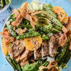 - Combine all the ingredients together in a large bowl (or 2). Add the chicken and snap peas on top. Drizzle on the dressing, then top with the crispy wontons.
