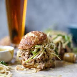 - Assemble the sandwiches on the bun of your choice with the maple mustard on the bottom, the pork piled on top and lots of apple slaw!