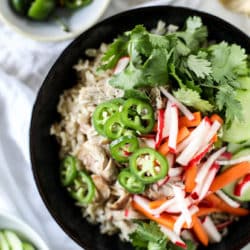 This recipe comes from my friend Gina’s new cookbook, Skinnytaste Fast and Slow. I seriously adore Gina – she is amazingly genuine and kind. AND her recipes are killer! I never thought to make a bowl version of banh mi and am always stuck on the sandwich idea. When made this way, the options are absolutely endless for the pork.