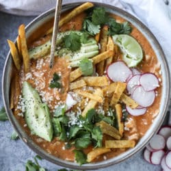 Yes, you’re going to put corn tortillas IN your soup! And let them cook down and thicken the soup. It’s the best thing I’ve discovered in all of 2016. It’s a fantastic way to thicken soup without cream or milk. Amazing!