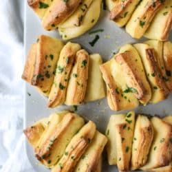 Made these to serve with a pasta dish for my Dad’s birthday tonight. I put mine in a muffin tin and ended up with 8 rolls (I used 4 “squares” in each ). Everyone was RAVING about them. As I didn’t have any fresh herbs, I didn’t end up making the “Melted Herb Butter” but instead added some dried herbs (basil, parsley and oregano) to the butter that I brushed on the dough before the second rest. Turned out beautifully!