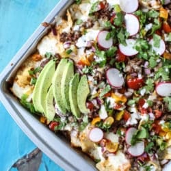 This beef has so.much.flavor. Like a ridiculous amount. The green chile creme drizzled on top is a dream. The crunchy radish slices and quick pico is perfect! There is a boatload of cheese and I’m sure you wouldn’t expect it any other way.