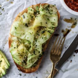 I know that I just recently shared my favorite winter avocado toast, but this here is another version that I came across over the holiday season and I’ve been eating it like a crazy person. It is SO good. The idea reminds me of last winter when I couldn’t stop eating sesame cucumbers with everything – especially my veggie cream cheese and smoked salmon toasts.