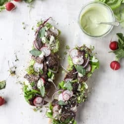 - To assemble the sandwich, spread the avocado horseradish over the baguette. Top with a few slices of butter lettuce. Add on the onions, sliced steak, radish and thai basil. Drizzle on extra horseradish. Slice and serve!