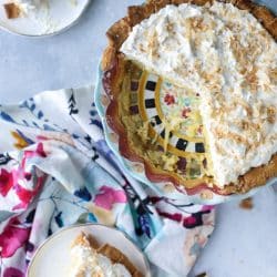 • Pour the custard into the pie crust. Bake it for 45 to 50 minutes, until the center isn’t jiggly and the custard is golden brown on top. If needed, you can cover the pie crust edges with foil if they are getting too dark. Let the pie cool completely. Right before serving, make the coconut whipped cream and top the pie with it. Sprinkle on the toasted coconut.