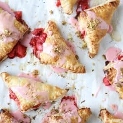 - After 5 to 10 minutes, drizzle the turnovers with the strawberry glaze. Sprinkle the chopped pistachios on top. Serve immediately!
