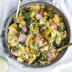 I used an egg noodle fettuccine which I LOVE because it is so delicate and light. This bowl is satisfying but doesn’t feel heavy. I would say that it more appropriately serves two, but generously. If you serve it with a salad and some dessert and maybe a big old cheese plate (hint hint) next Sunday, it would go a long way for four. Yes yes.