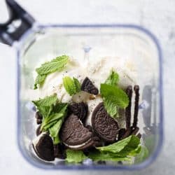 - Add everything to a blender and… blend it! Serve with a big old sprig of fresh mint AND some whipped cream if it’s not too rich. Maybe some cookies on top. Go get it.