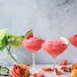 - Scoop the frosé into your glasses and garnish with a watermelon wedge.