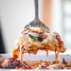 - Cover the zucchini with the marinara sauce. Top with the mozzarella cheese. Bake for 20 to 25 minutes, until golden and bubbly. You can broil that last minute for more bubbliness! Remove it from the oven and top with extra fresh parm and the fresh herbs. Serve immediately, just remember – it’s hot!