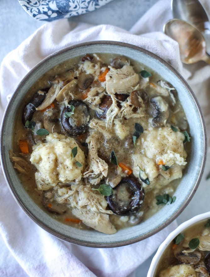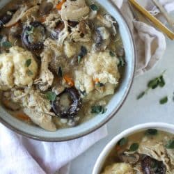 So this version! Is made with leftover turkey (or of course, you could use chicken!) and also with mushrooms. It’s basically mushrooms and dumplings. Those of you that hate the fungi can stick with the old version and those of us that looooove that mushrooms can have this all to ourselves.