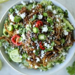 • Place the avocados, the cheese, cilantro, onion, lime juice, salt and pepper to a bowl and mash it! Mash and stir until everything is combined. Make it as smooth or as chunky as you’d like! Taste and season with additional salt, pepper or lime juice if needed. Top with the pork, a sprinkle of extra cheese and cilantro and a few sliced peppers!