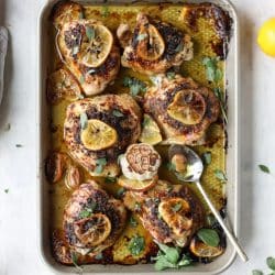 This recipe is a winner. It’s so easy and very flavorful. I used regular lemons and the “bone-in-with-skin” thighs. I sliced the garlic and put it under the chicken’s skin. It was succulent and brought smiles to my table. Thank you for this inventive dish.