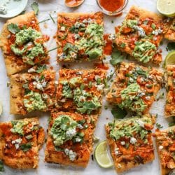 My favoritest ever (yes I said it) buffalo chicken pizza is in Seriously Delish. I’ve shared versions of it here with these buffalo chicken French breads and what not, but never posted the exact pizza! I have a SUPER old buffalo chicken pizza recipe on the blog that some of you still make, but it isn’t anywhere near this. We are talking… REVAMPED. So this is the exact pizza… plus more. Plus guacamole!