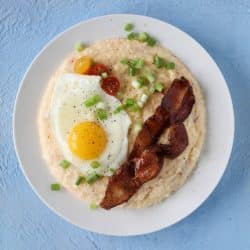 - To serve, spoon the grits into bowls. Top with an egg, a slice or 2 of bacon and some green onions. I like to serve with a spoonful of extra pimento cheese!