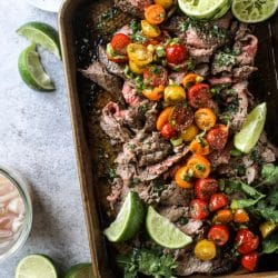 - Allow the steak to rest for 10 minutes before slicing it thinly against the grain. While the steak is resting, toss together the cherry tomatoes, onions and cilantro with a pinch of salt and pepper. Juice half the lime over top and toss well. Place the tomatoes on top of the sliced flank steak and serve. We love to do this as tacos, on salads, or as a main dish with rice, quinoa or potatoes, along with a green veggie like asparagus or broccoli!