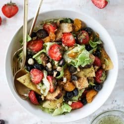 We went strawberry picking this past weekend and the abundance of fresh, wildly sweet strawberries makes me so happy. And believe it or now, more so than cobbler, this salad is my favorite way to consume the red gems.
