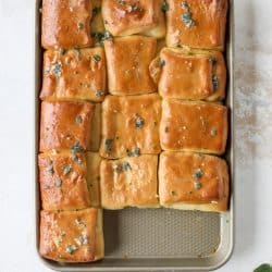 Until now, I’ve very much been in the camp that no one should spend allll the time making bread on Thanksgiving day. (Even these garlic butter pull aparts couldn’t sell me.) And that’s pretty much when it has to be baked because fresh bread is the best bread. Right?