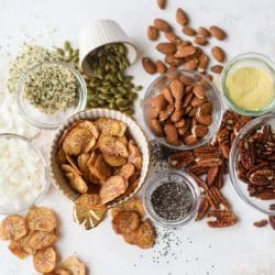 I love making this on the weekends and portioning it out to have for snacks during the week. It is so good to have on the go. It’s also really satisfying because of the nuts, coconut oil and flaked coconut. The chia and hemp hearts help too! There are all different sorts of textures here and that just pleases my brain.