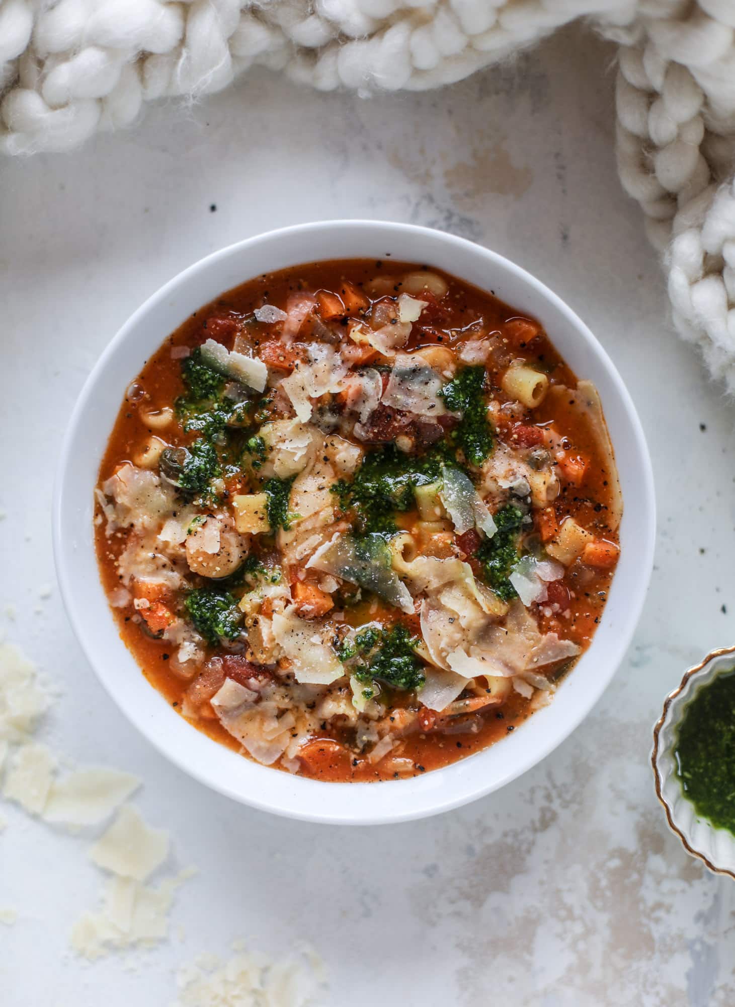 I made this and it’s delicious, hearty and easy! I might go as far as saying it’s the bomb! I did make a few minor changes. I used butter and oil to sauté the veggies and also added some parsnips which just add a different sweet flavor layer. I also used chicken broth and baby bow ties for the pasta. I put the raw spinach in the bowls and ladeled the soup on top and mixed it in just to give a fresh bite to the spinach. Topping it with shredded pecorino and leaving out the pest drizzle. Just perfect and will probably end up being my go to soup now! Thank you.