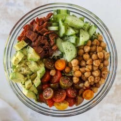 I couldn’t help sharing it now, but it may be even more in the rotation come summer. It’s a salad that you can prep all the components for ahead of time: make your bacon, chickpeas, ranch and cut the remaining veggies a day or so before. Keep the components separate until mealtime, then toss together and eat!
