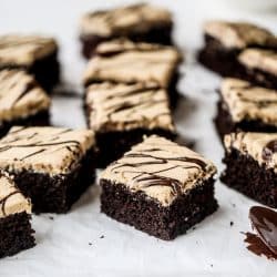 - Frost the cooled cake with the peanut butter frosting. If desired, you can drizzle melted chocolate overtop. I usually just melt about ½ cup of chocolate chips in the microwave and drizzle it over top. Slice and serve!