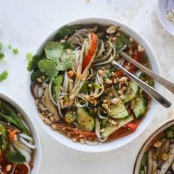 - To make the bowls: add a serving of rice noodles to a bowl, then top with a few mushrooms, red peppers, carrots, snow peas and cucumber slices. Ladle 1 cup (or so!) of broth over top. Add on your toppings of choice. I love fresh cilantro, toasted sesame oil and chopped peanuts!