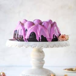 - Add the flour and beat on medium speed for 2 minutes. Beat in the cooled coffee cocoa mixture and beat for another 3 minutes. Pour the batter into the bundt pan. Bake for 60 minutes, or until the cake is set and a toothpick inserted into the cake comes out clean. Remove and let cool completely. Once cool, turn the cake out onto a plate or cutting board and drizzle the dragonfruit glaze on top. If desired, you can crush some culinary rose petals on too!