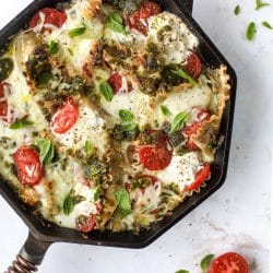 This caprese skillet lasagna has SO much the flavor. The bottom layer starts with a bunch of garlic, shallot and burst cherry tomatoes. This creates a rustic “sauce” of sorts without adding in tomato sauce and I just love that. You can mash the tomatoes into a sauce or leave them whole.