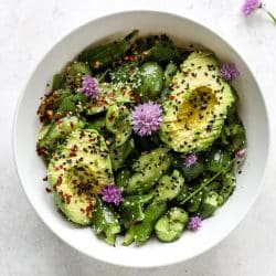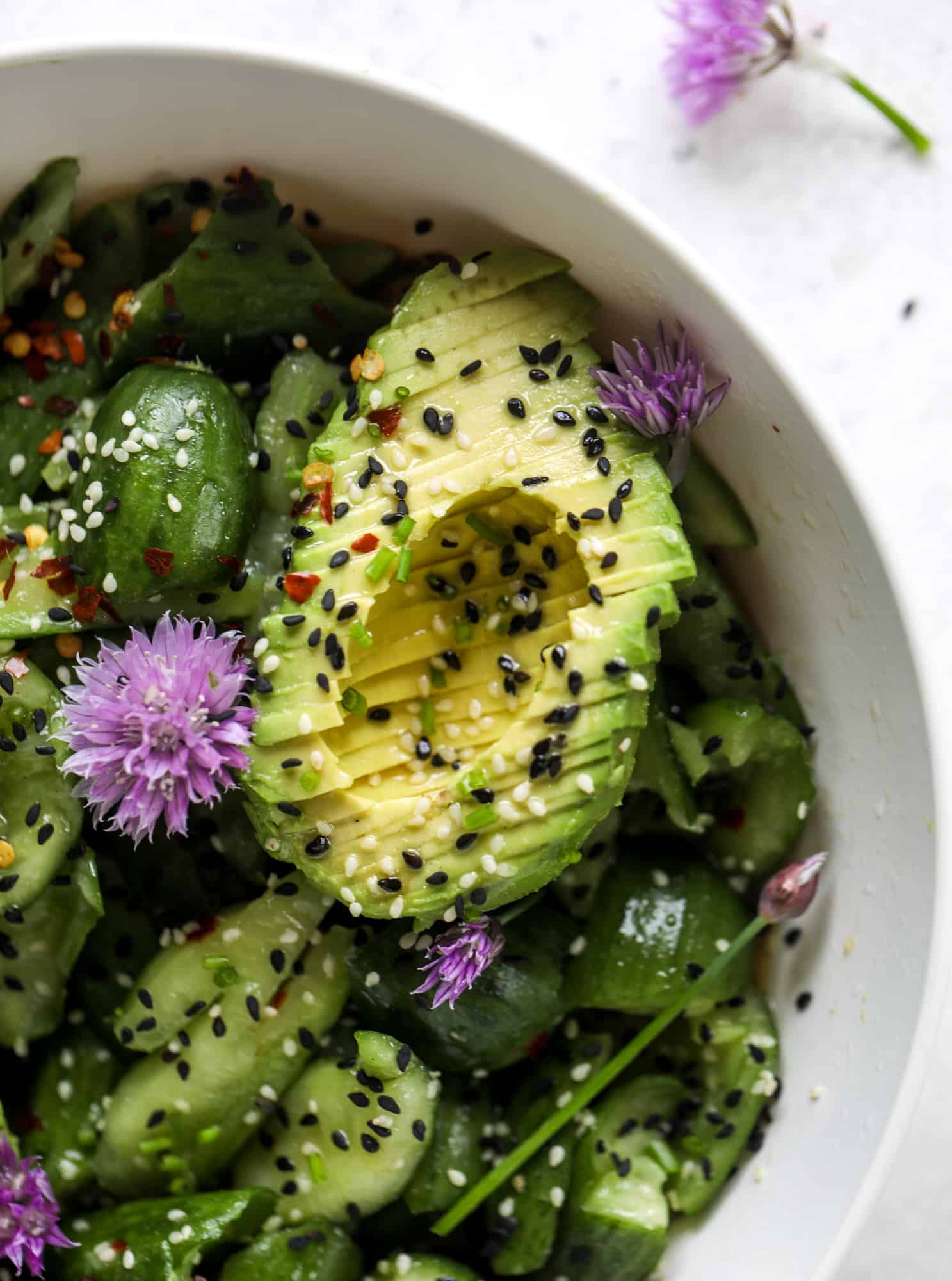 - Drain the cucumbers and place them in a large bowl. Add in the avocado. Pour on the dressing and toss well to combine. Sprinkle on the sesame seeds, chive and chive blossoms. Serve immediately!
