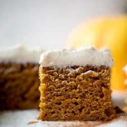 Out of all the pumpkin cake recipes I found, this was the only one that used brown sugar only, baking soda (not baking powder), and Greek yogurt. I was afraid the texture would be too wet and moist (something I’m afraid of in cakes, where the cake sticks on the roof of your mouth) but seeing the 5 star reviews, I proceeded to make this cake. Wow! The texture and crumb of this cake was PERFECT—moist and spongy (springy?) at the same time, lovely rich taste (from the brown sugar). I did adjust the sugar—I used 1 cup of cane sugar and 1/3 c brown sugar. I also used a whipped cream/cream cheese frosting instead. This is my go to recipe for pumpkin cake now!