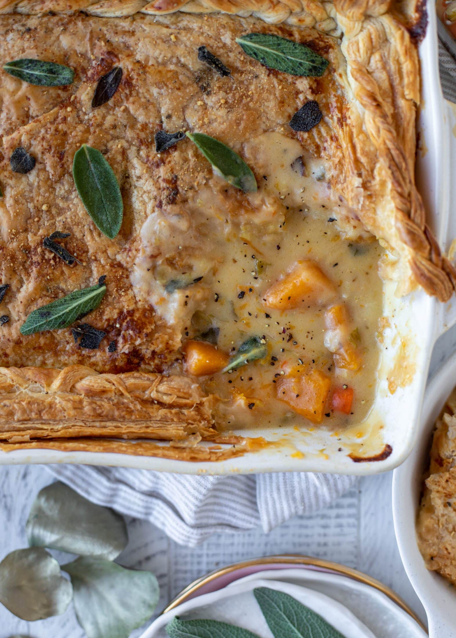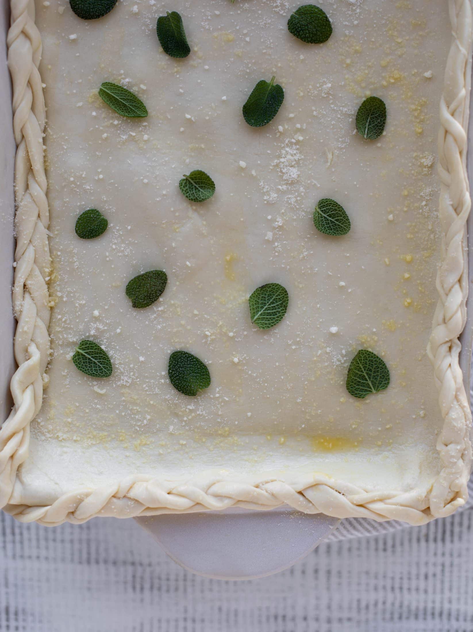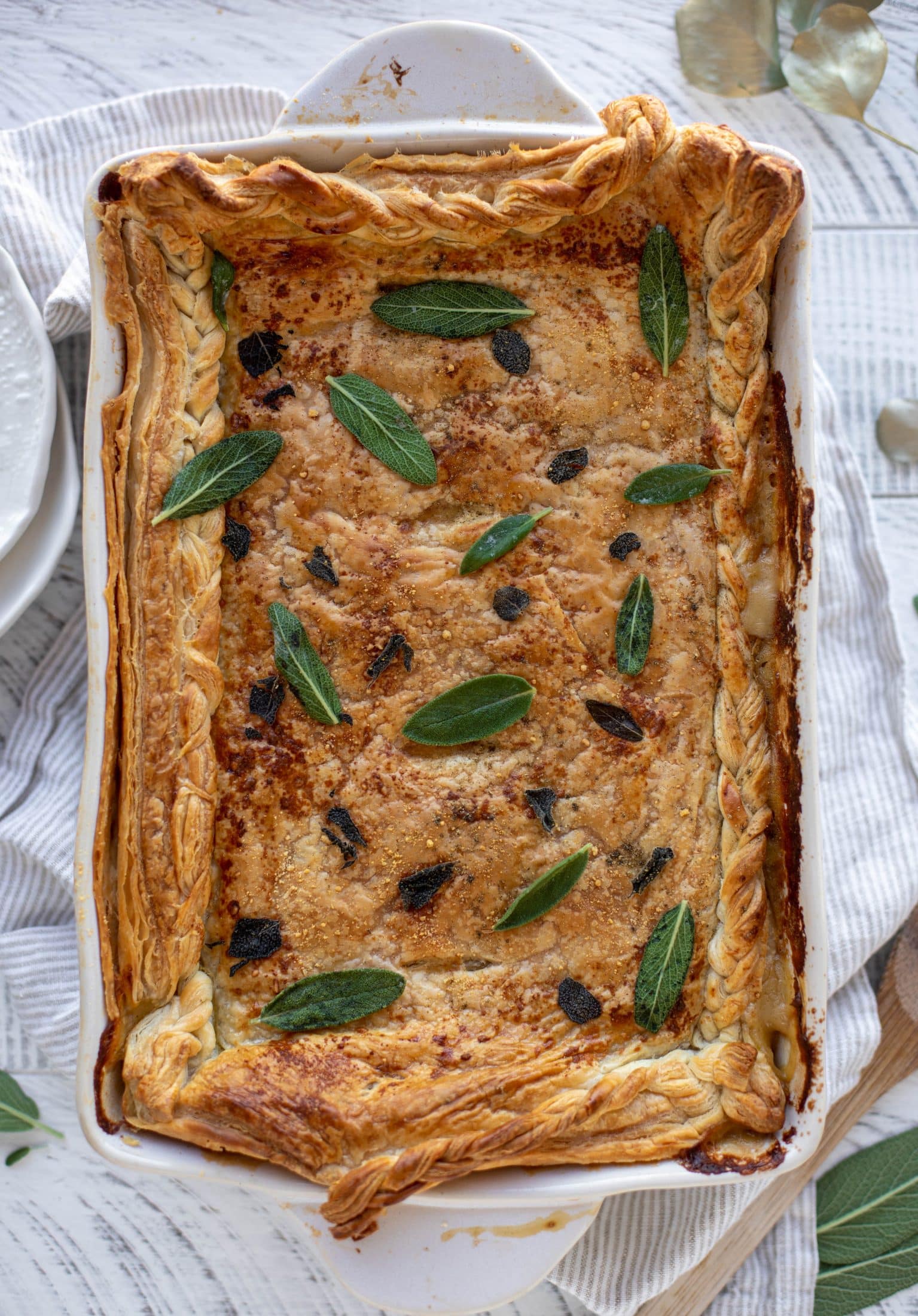 - Pour the filling into the baking dish. Layer the puff pastry over top. Beat together the egg and water in a bowl, then brush it all over the pastry. Press the sage leaves into the pastry and sprinkle with parmesan. Use a sharp knife to cut slits in the puff pastry so the steam escapes.