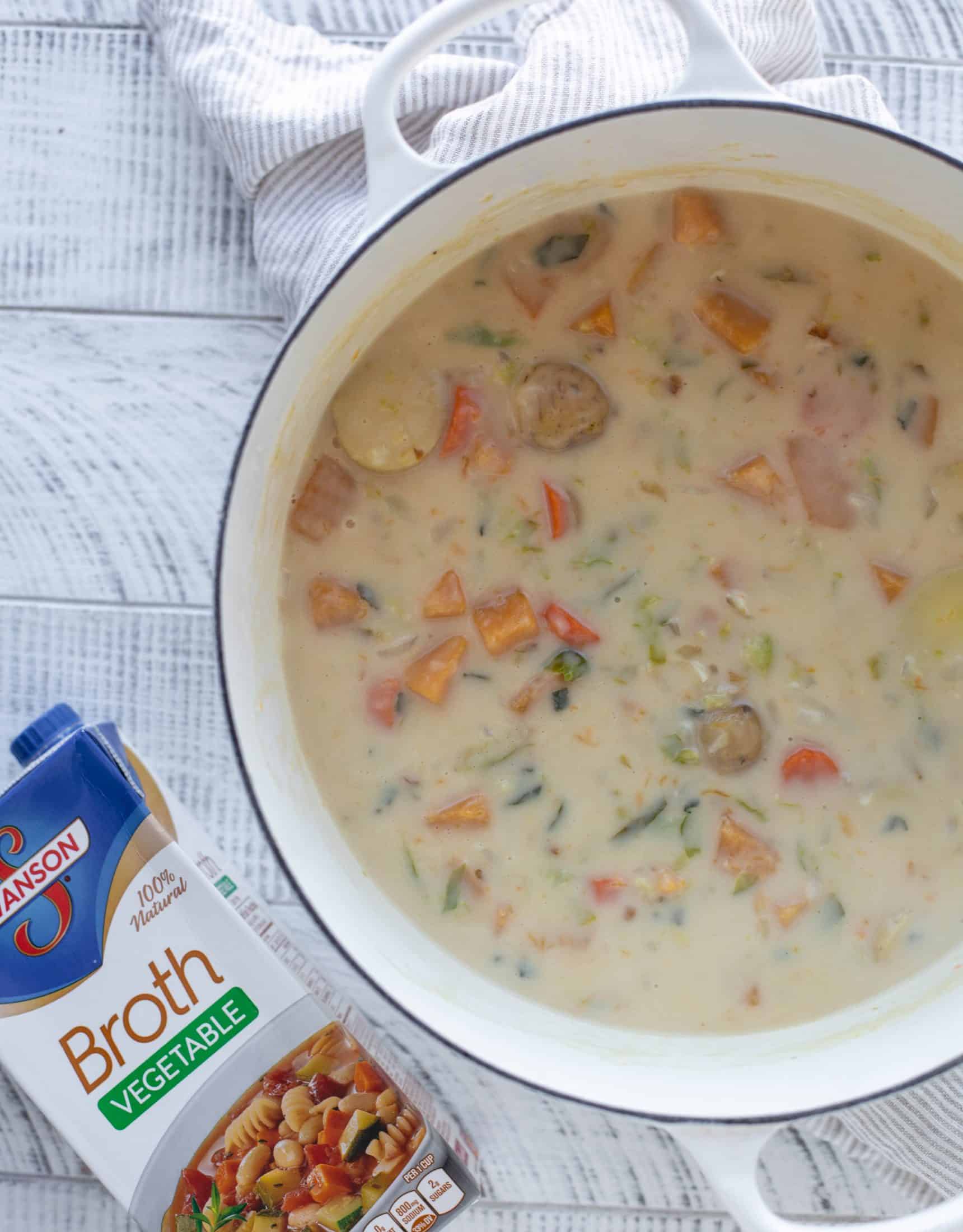 - Fill a saucepan with the squash, carrots and potatoes. Pour the Swanson Vegetable Broth over top. Bring the mixture to a simmer and cook for 10 to 15 minutes, until the vegetables are tender. Place a strainer over a large bowl and pour the vegetables into the strainer, catching the broth in the bowl. We will use the broth to stir into the base!