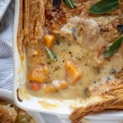 I also love puff pastry for the topping because it’s lighter – which really counts in this otherwise rich dish. It’s flakey and delicious, yes, but it’s also light and airy on top of the saucy filling. Works so perfectly together!
