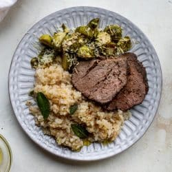 Now! On to the side. Truffled risotto! It’s a classic risotto with a drizzle of truffle oil (get the real stuff!) and a pinch of truffle salt. Topped with crispy sage… oh my gosh. It’s such a major flavor party in your mouth.