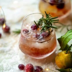 - Pour in a chilled glass and garnish with a cherry, sugared cranberries and rosemary.
