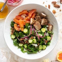 This pecan crusted chicken salad is so hearty! Kale, cara cara oranges, pickled onions, cucumbers and pecorino make this a bowl of flavor.