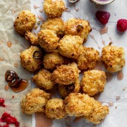Baked Popcorn Chicken with Raspberry Hot Honey.
