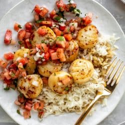 • Serve the scallops topped with the watermelon salsa. I love to serve these with jasmine rice too. However, if you’re having a dinner party or making them as an appetizer, they are great on their own with the salsa. As a great accompaniment to surf and turf!
