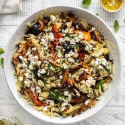 I have made this twice and will keep making it! Love love love it. Amazing flavor and easy. I have doubled the veggies and halved the pasta, the second time. I used ditalini as I couldn’t find orzo. I also oven roasted the veggies.
