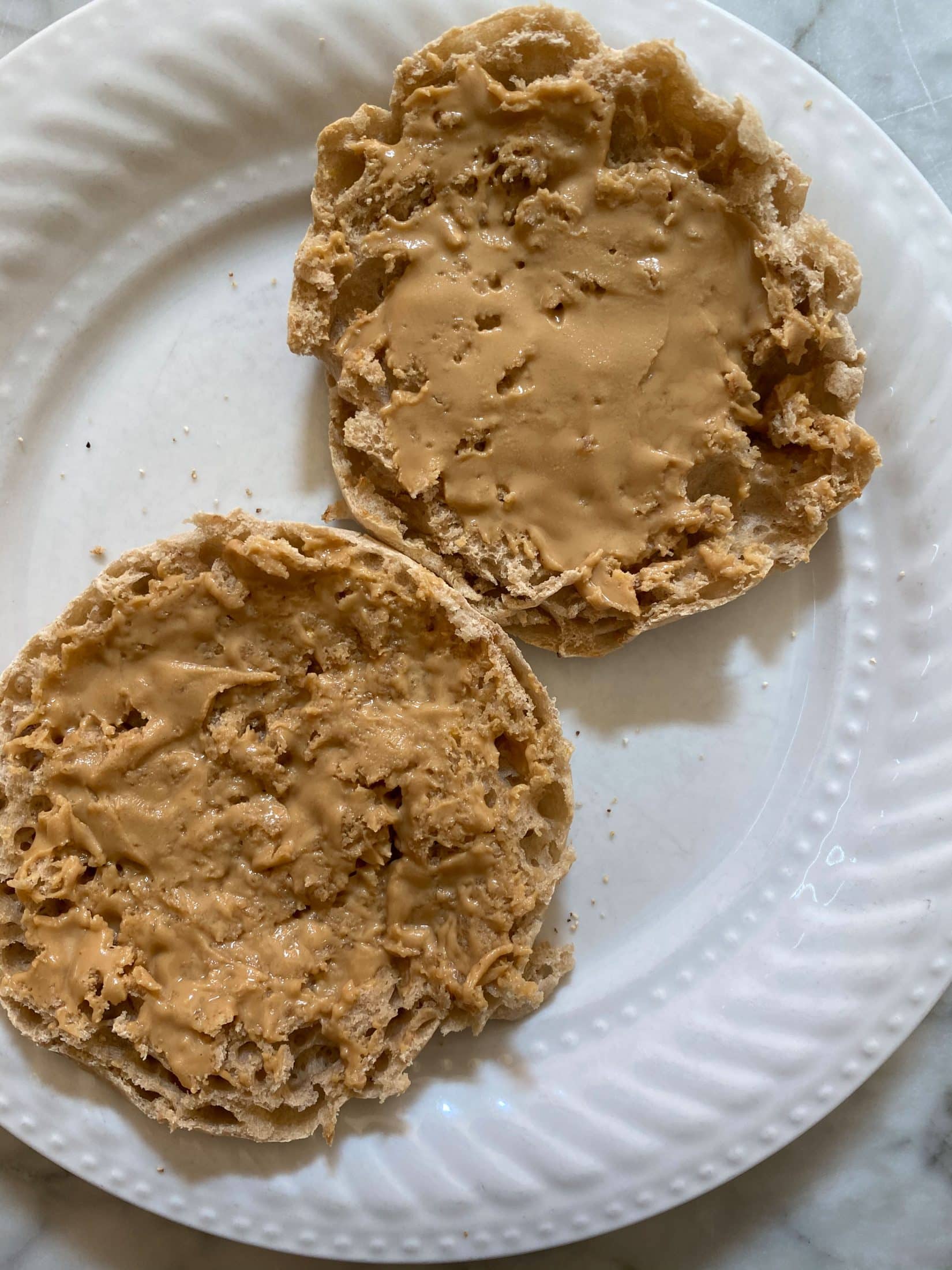 A boring, predictable yet delicious and satisfying breakfast: multigrain english muffin + barney butter. Oh plus sea salt!