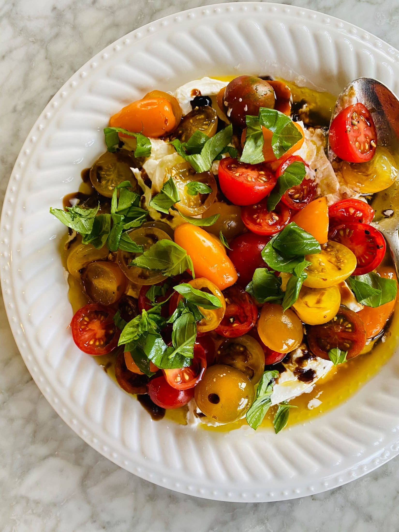 The tomatoes went on top of burrata. I could eat this plate forever. And basil from my herb garden!