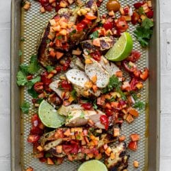 This chicken (you can use breasts or thighs!) is marinated a cilantro lime vinaigrette, grilled to perfection and served with a peach pico de gallo on top.