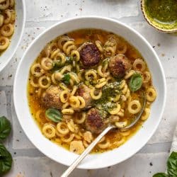 I can’t wait to make this again!!! I ended up doubling the meatball part of the recipe and added all of the pesto to the meatballs. At the end I added some frozen chopped spinach to the soup. It’s a new favorite!