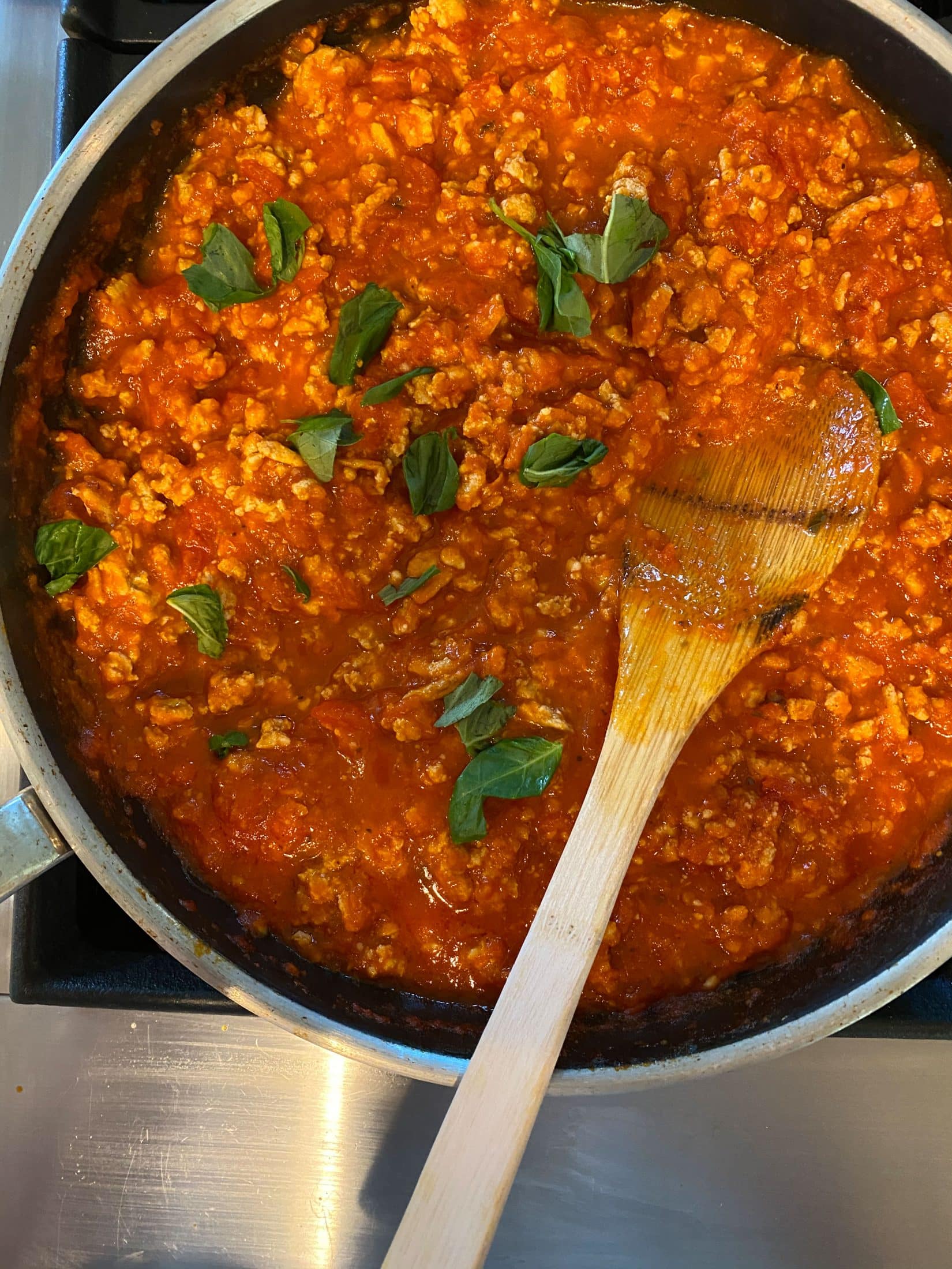 Quick little turkey meat sauce with fresh basil.