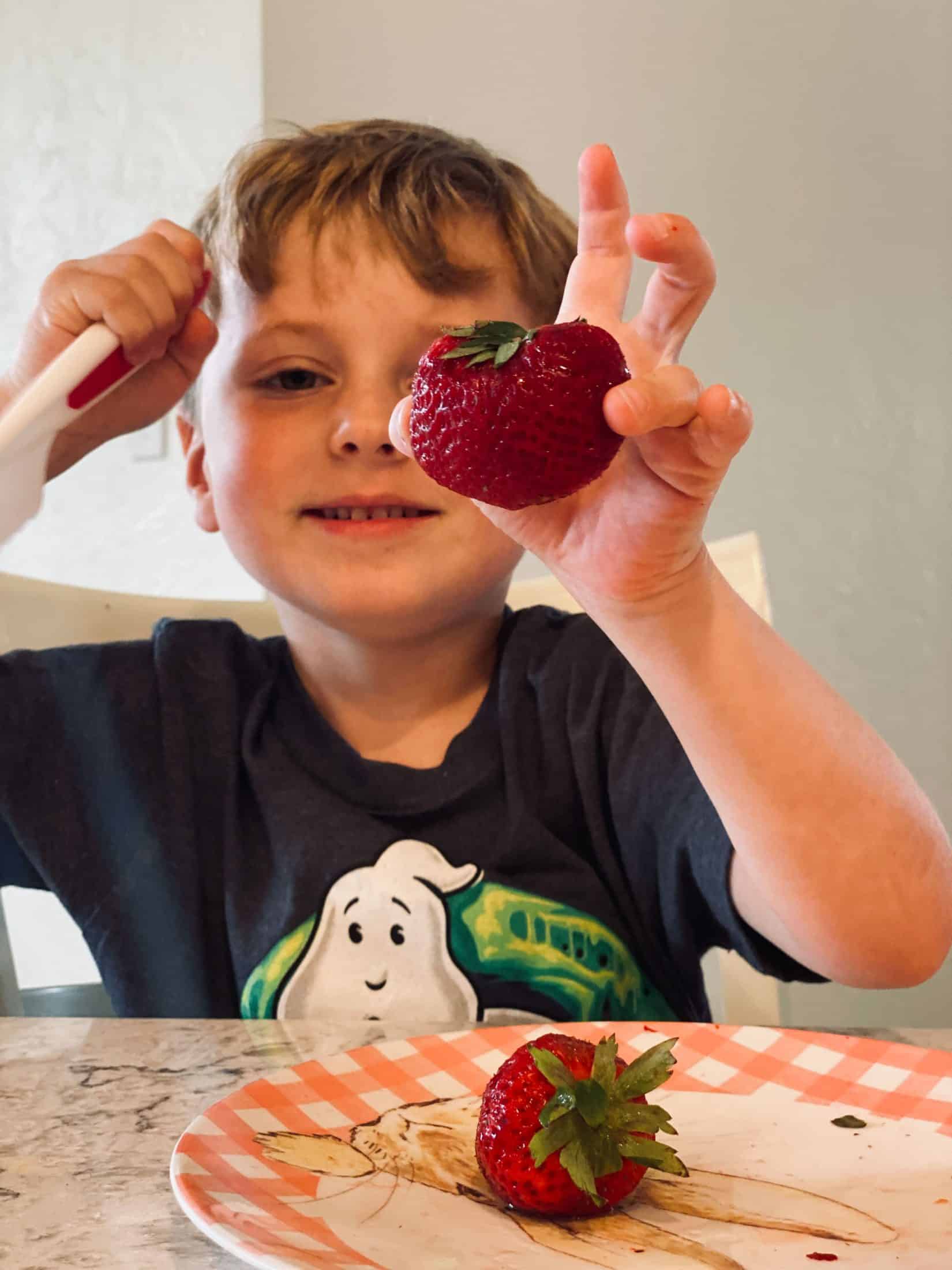Cut a few strawberries ourselves. On an easter plate.