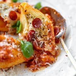 Now, if you’re looking for a top notch dinner idea to get you through the next few months – one that everyone will love, I’ve got you today. This has all the flavor of pizza stuffed into pasta shells and baked until cheesy and melty.